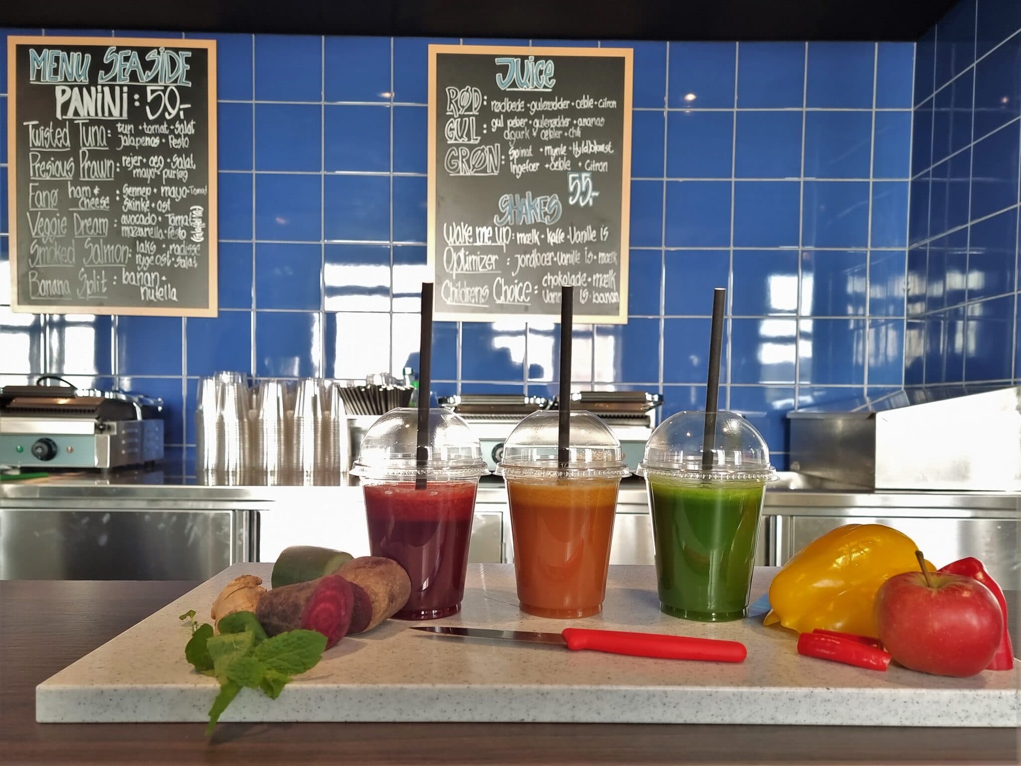 Café med kvalitetsmad, juices og shakes samt kaffe, is og hurtig service
